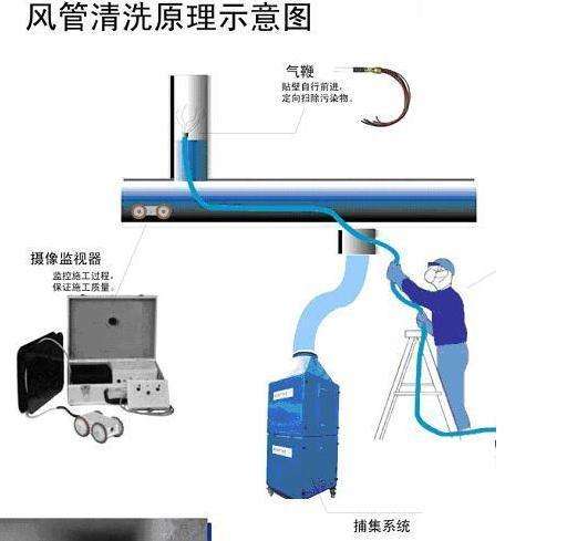 一、直接吸塵法(適合大、中型矩形風(fēng)管)拆除各種風(fēng)口 → 專業(yè)單位測定風(fēng)管內(nèi)積塵情況 → 放入檢查機(jī)器人觀察風(fēng)管內(nèi)部情況,確定清洗方案(可制作光盤) → 放入清掃機(jī)器人打松積塵 → 放入吸塵機(jī)器人吸走灰塵 → 放入噴霧消毒機(jī)器人噴灑消毒劑 → 放入檢查機(jī)器人觀察風(fēng)管清洗后情況(可制作光盤) → 專業(yè)單位測定風(fēng)管清洗后情況 → 安裝各種風(fēng)口 → 出具清洗完工報(bào)告。 二、揚(yáng)塵吸塵法(適合中、小型矩形風(fēng)管)拆除各種風(fēng)口 → 專業(yè)單位測定風(fēng)管內(nèi)積塵情況 → 放入檢查機(jī)器人 → 觀察風(fēng)管內(nèi)部情況,確定清洗方案(可制作光盤) → 在需清洗的風(fēng)管二頭放置二個(gè)氣囊并于其中一邊開一個(gè)圓形工藝孔,并把該孔與捕集器的吸入口用軟管聯(lián)接 → 再在另一邊放入清掃機(jī)器人邊走邊打松灰塵由捕集器同時(shí)把灰塵吸走 → 放入噴霧消毒機(jī)器人噴灑消毒劑 → 放入檢查機(jī)器人觀察風(fēng)管清洗后情況(可制作光盤) → 專業(yè)單位測定風(fēng)管清洗后情況 → 安裝各種風(fēng)口 → 出具清洗完工報(bào)告。